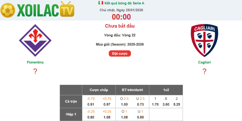 Bảng tỷ lệ kèo trận Fiorentina – Cagliari